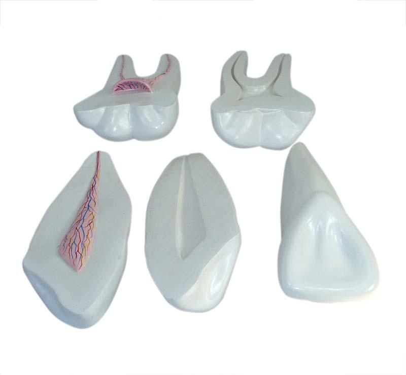 This model shows the morphological differences of the incisor, canine and molar teeth. Dissections of the canine and molar teeth demonstrate the structure of the enamel, dental pulp cavity. 3pcs/set. 12 times enlarged.