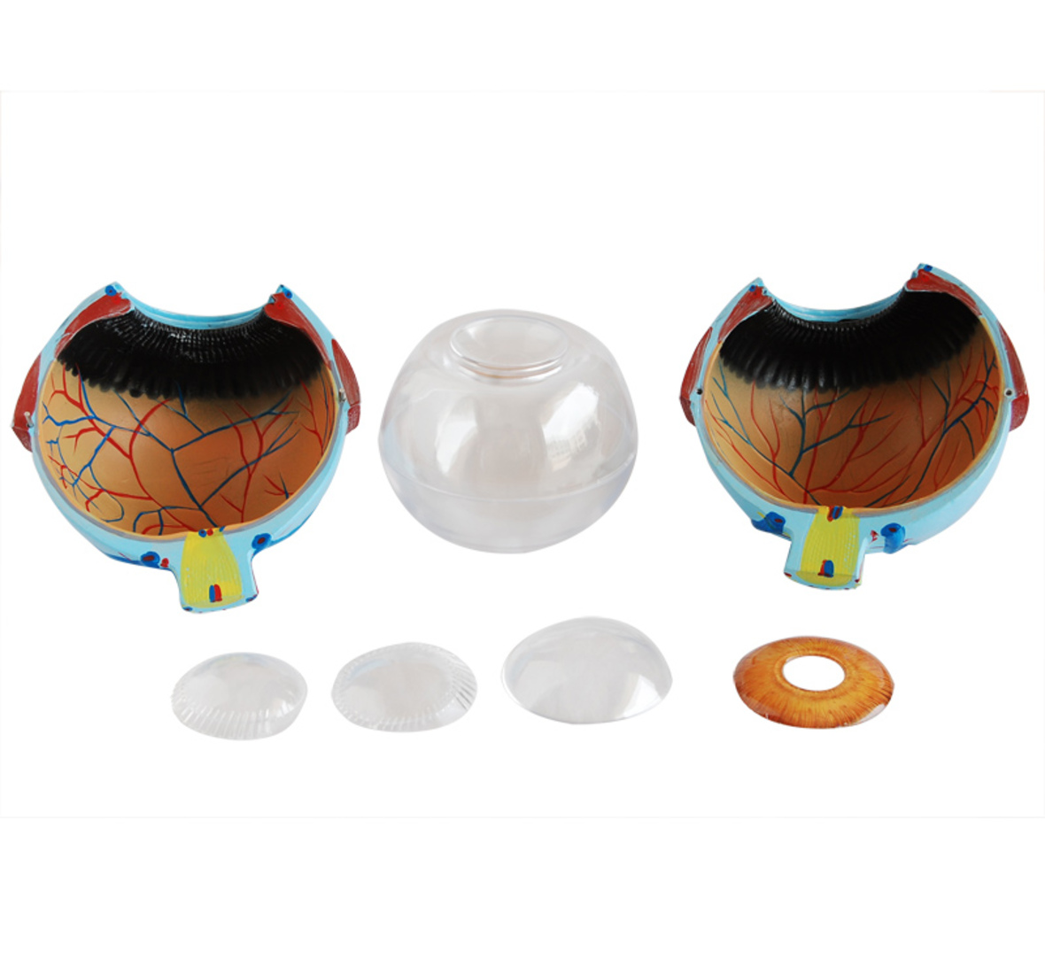 The different parts of the eyeball model are detachable to show the following structures. 1. Tunica external: showing cornea and sclera with attachments of ocular muscles and optic nerve. 2. Tunica media: showing the iris, the ciliary body and the chorioid. 3. Tunica internal is retina. 4. Refraction media: showing the lens and the vitreous body. 6 times enlarged. On stand.