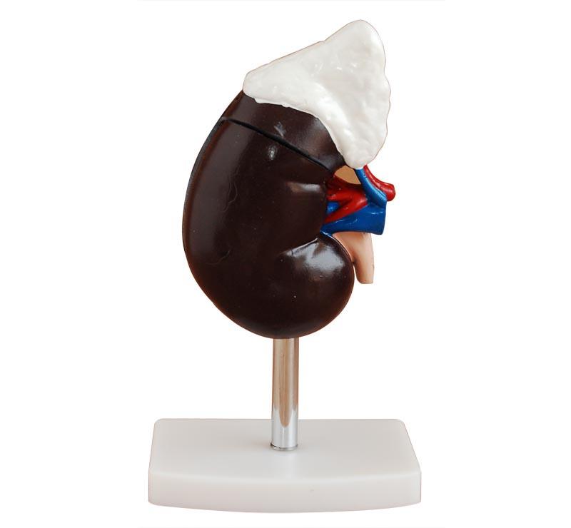 This model features the kidney with adrenal gland, renal and adrenal vessels and upper portion of the ureter. Dissected into 2 parts to reveal the cortex medulla, vessels and renal pelvis. Life size.