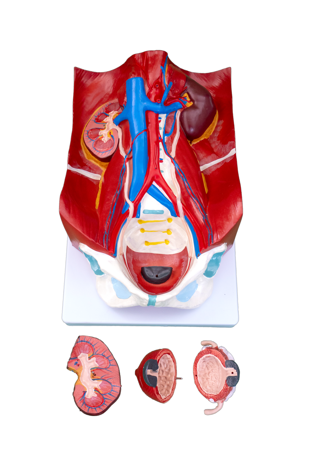 The model shows the structures of retroperitoneal cavity, pelvis with bones and muscles, inferior vena cava, aorta with its branches, upper urinary tract, kidney with adrenal gland, ureter, bladder, etc. Dissectible into 4 parts.